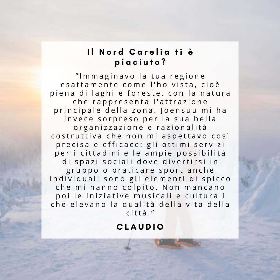 Così ci salutiamo qui, nella regione dei mille laghi, in Carelia del Nord. I careliani sono conosciuti come i "meridionali" della Finlandia, per la loro natura socievole, aperta e amichevole, che li distingue dal resto della Finlandia.