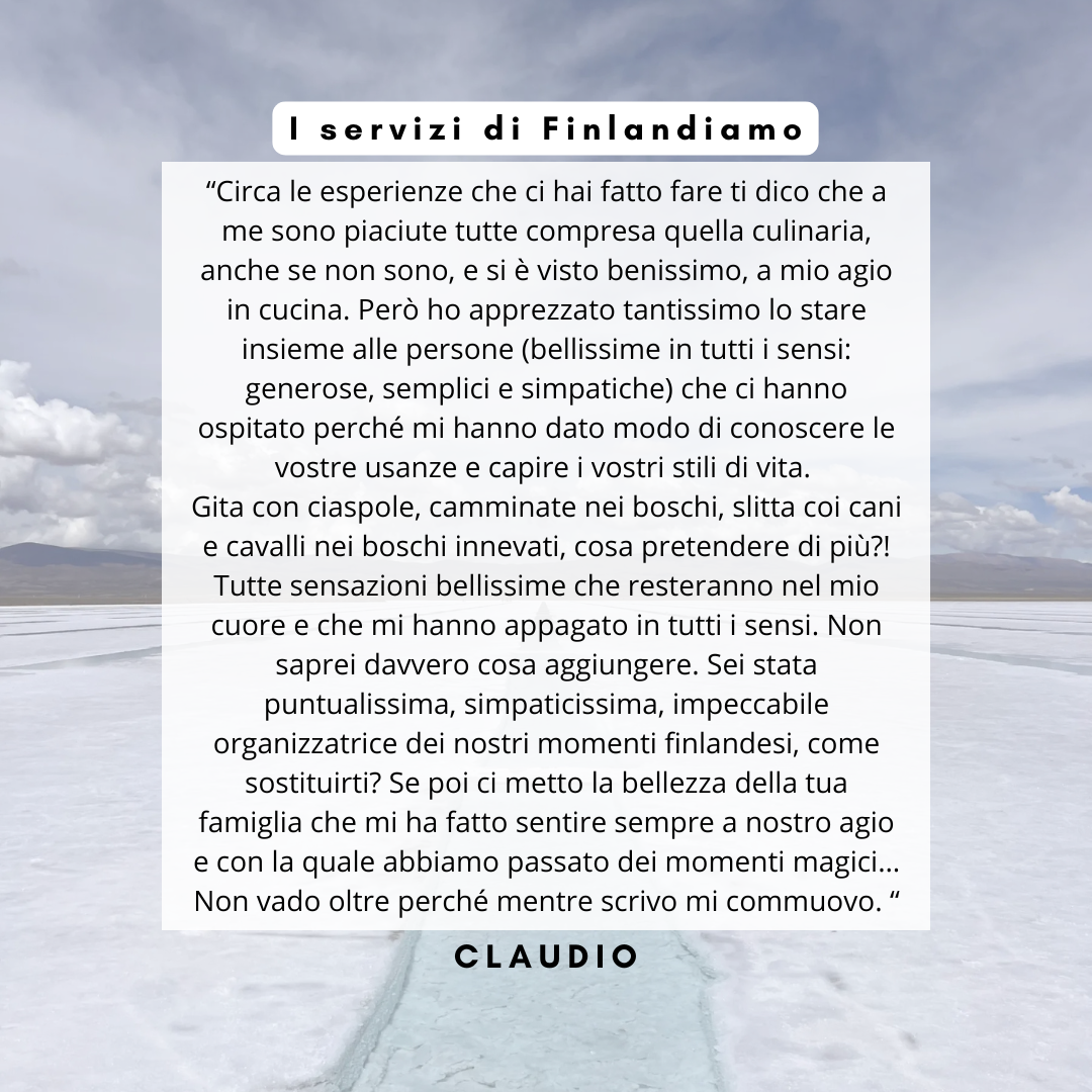 Io e mio marito ci siamo affidati ai sapienti consigli di Finlandiamo (nella persona di Henrietta). Scelta perfetta. Siamo stati in posti meravigliosi , accolti in una baita da sogno e abbiamo avuto la sicurezza di poter chiedere sempre supporto in qualsiasi momento. Il tutto all' inizio di settembre. Siamo rientrati con la voglia di conoscere questa zona anche in inverno. Per cui presto ci risentiremo!